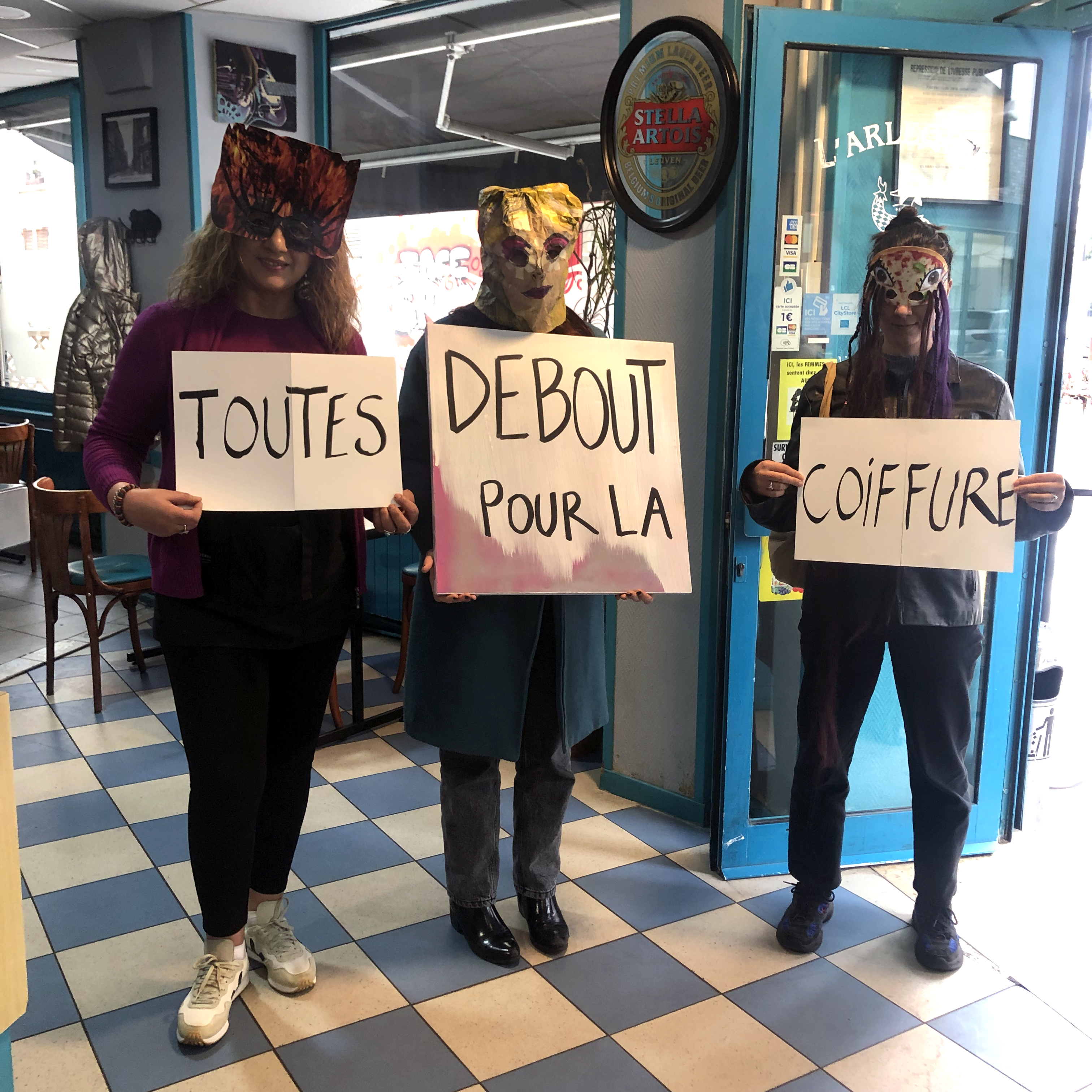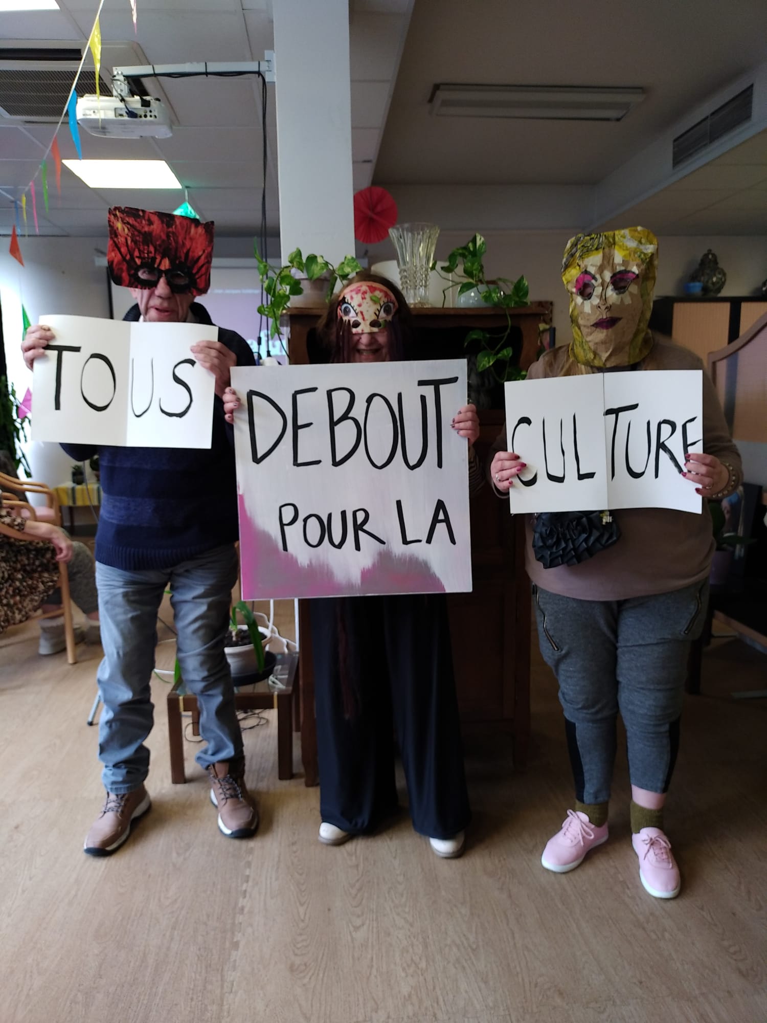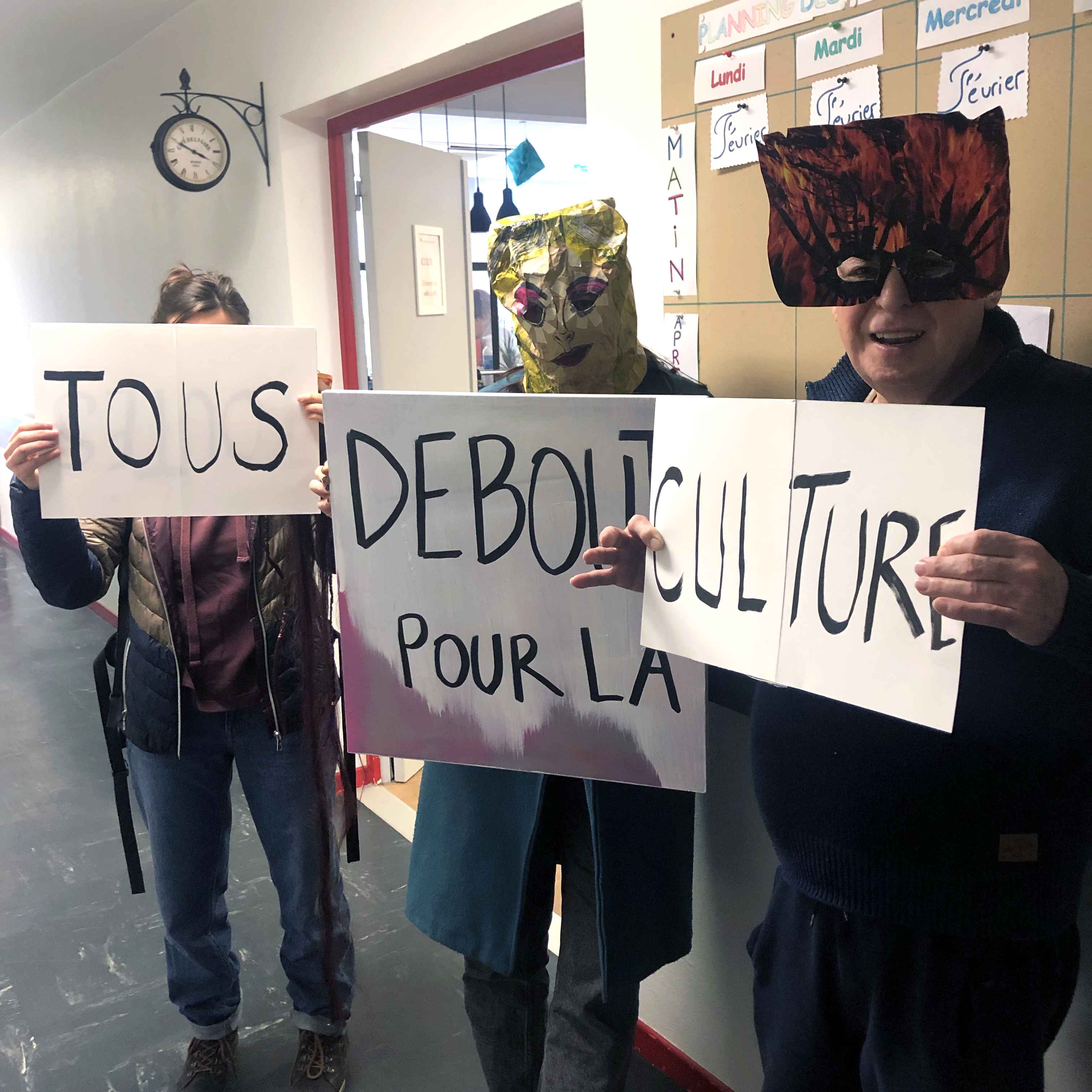 À Aubervilliers, Clotilde Salmon et Estelle Bertin (cie La pépite) ont pris cette consigne au pied de la lettre, en la détournant légèrement : dans l’espace public, elles ont demandé à des personnes assis(es) — et uniquement assis(es) — de se lever et d’enfiler un masque dessiné en soutien aux artistes.