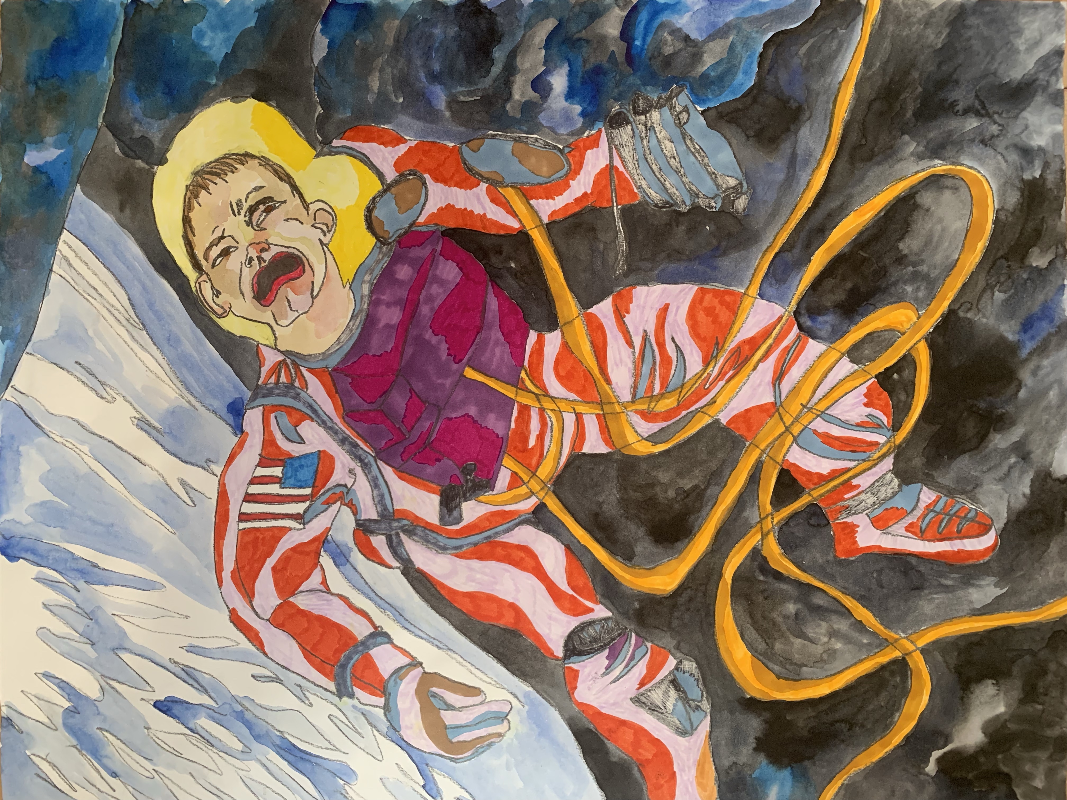 Pour symboliser plastiquement le processus de notre cerveau quand il rêve, j’ai entré des mots-clés tirés des textes de la performance dans des moteurs de recherche, en leur demandant de générer des images. Parmi ces propositions, je me suis particulièrement intéressée aux banques d’images pour leurs décors épurés, leurs expressions faciales hyperboliques. À partir d’une sélection, j’ai réalisé une soixantaine de dessins. Assemblés en diaporama, ils constituent la toile de fond du rêve, incarnant un processus créatif inconscient, en mouvement, avec ses absurdités et ses détournements aléatoires.