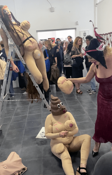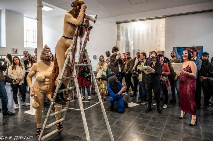 5 personnages masquées dont 2 créatures faussement nues fendent la foule avec un escabeau. Les créatures posent en hauteur tandis que les trois autres les dessinent et les filment. 15 minutes de poses plus tard, quand elles estiment avoir été suffisamment filmées, elles remballent.